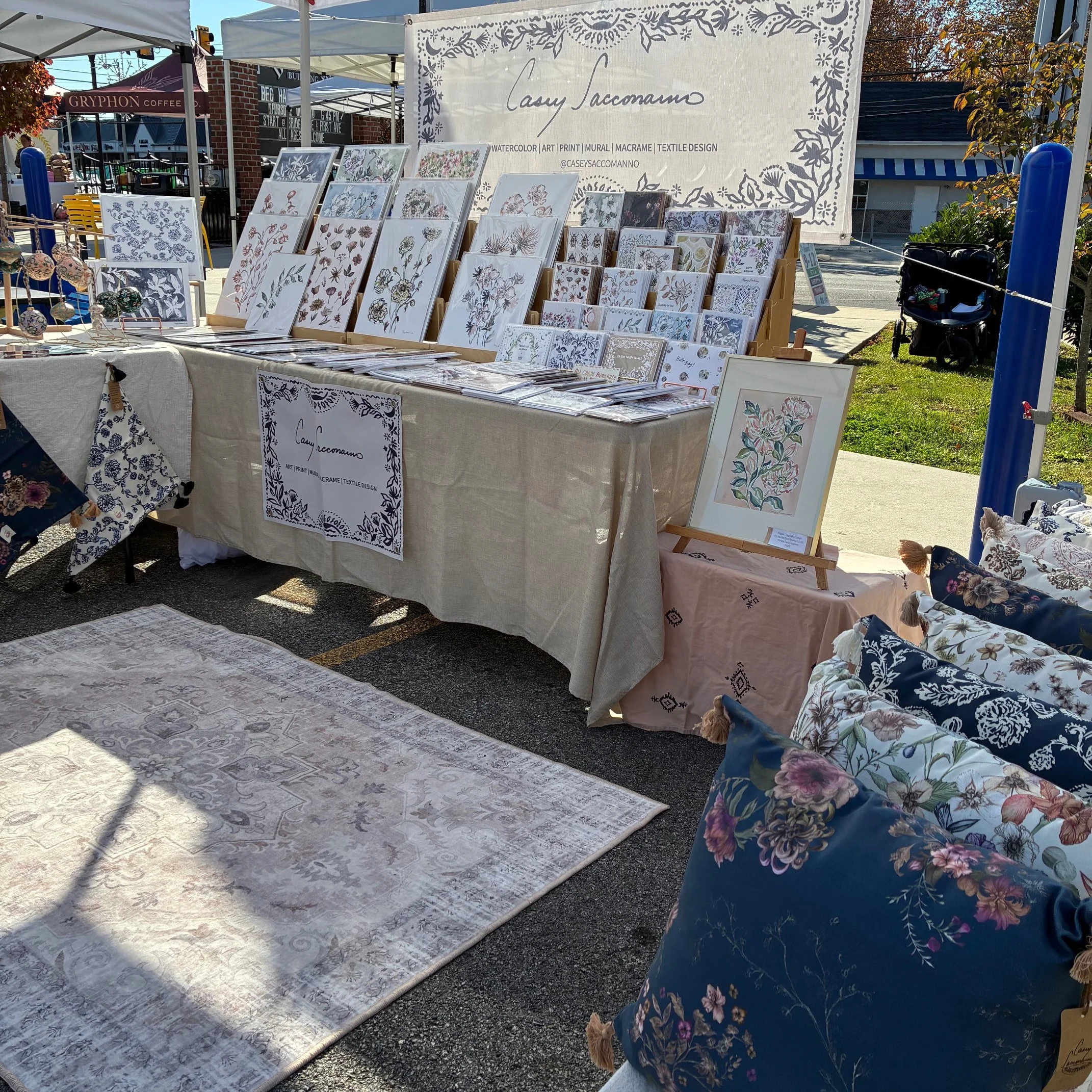 I will be fully stocked with throw pillows, Holiday greeting cards, hand painted ornaments, art prints, original artwork & macrame plant hangers & wall hangings at my market- I also have a full table at Julie Miller Pottery in Phoenixville with a selection of original artwork, art prints, and macrame.